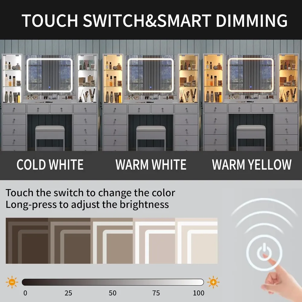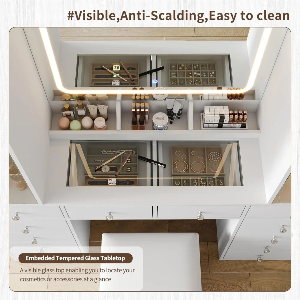 12 Drawers Makeup Vanity with Charging Station,Vanity Desk with LED Mirror &2 Glass Cabinet,3 Color Modes, Brightness Adjustable