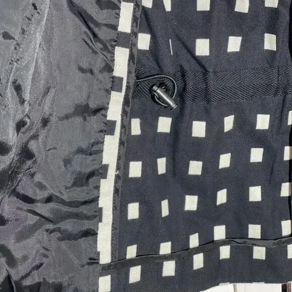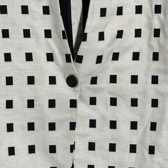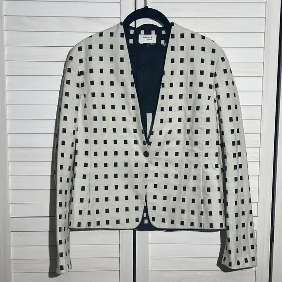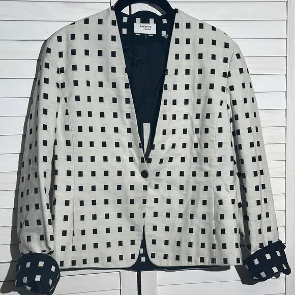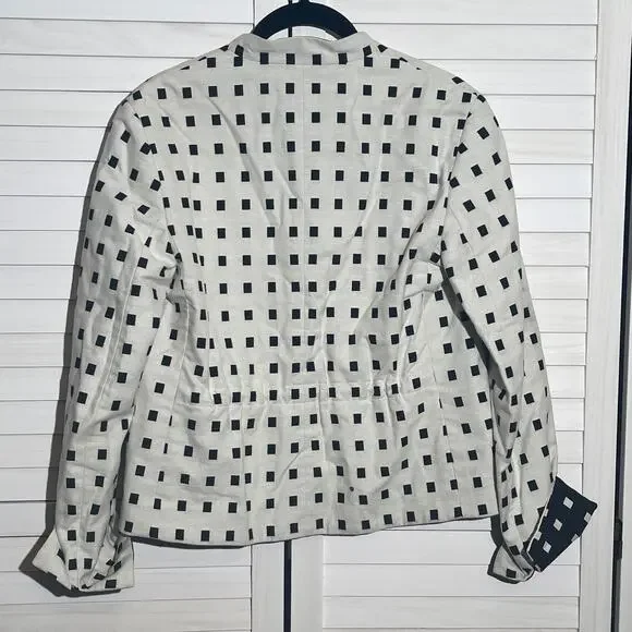 Akris punto black and white cotton blazer jacket in an Abstract Print styling Shawl collar1 button closure Long sleevesFront patch pockets Hip length Tailored silhouette CottonLining: CuproMade in Romania Akris Punto focuses exclusively on designer sportswear, combining the exquisite tailoring for which Swiss label Akris is known with accessibility on a broader scale. This independent collection was started in 1996 and is notable for its well-designed separates, which follow the lead of Akris Creative Director Albert Kriemler.