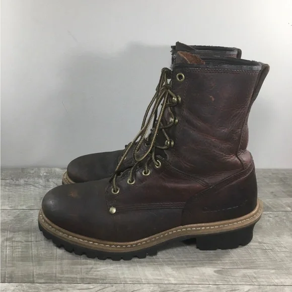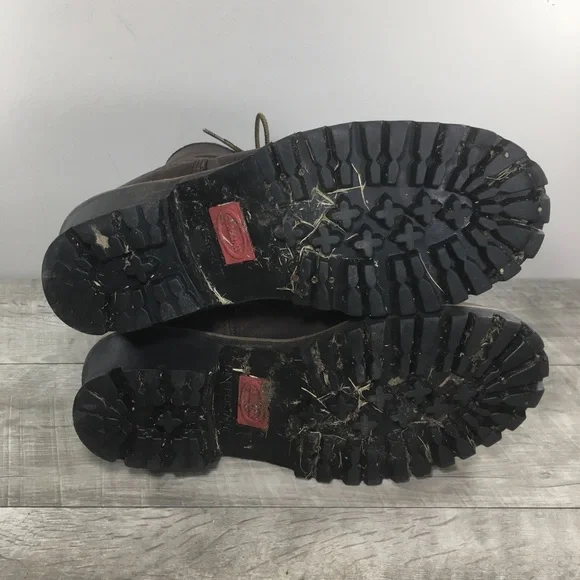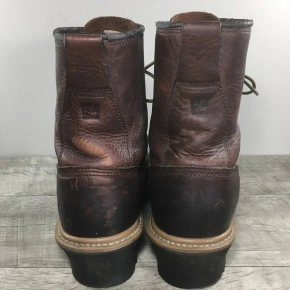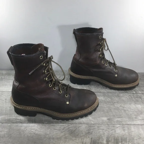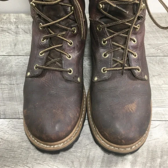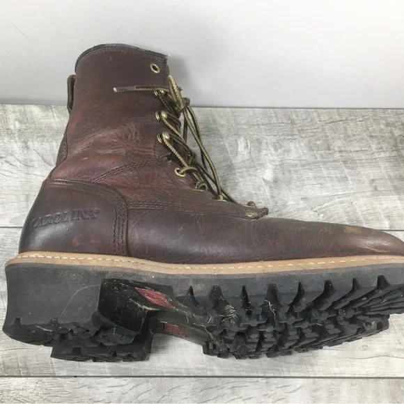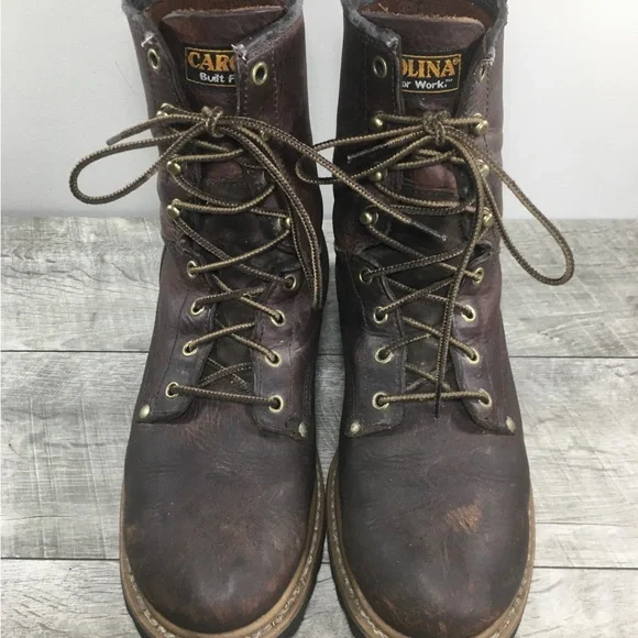 Up for sale is a good condition pair of Carolina CA821 Men’s Soft Toe Briar Pitstop Leather Lug Logger Boots. Size 9 D, Medium US. Leather uppers. Rubber soles. From smoke-free home. Clean inside and out. Very well built and sturdy. Approximate Outside Dimensions: 12 inches heel to toe by 4.5 inches across the ball of footwear by 2 inches tall heels by 9 inches tall.