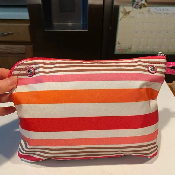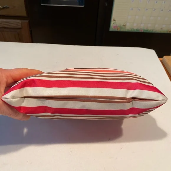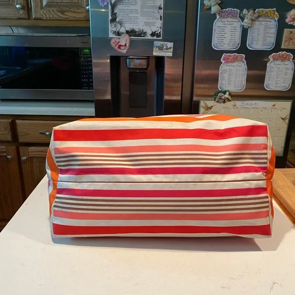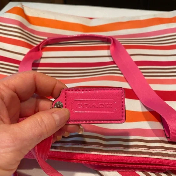 Coach Stripe Multi Sateen Patent Leather Weekender Getaway Tote Travel & Attachable Matching Cosmetic PouchSilvertone hardware Coach name tagReinforced handles Approximate size 11 3/4” tall 20.5” wide 7.5” depthStain outside, snag outside. Paint on edge of handle Zipper closure Attachable Matching Coach Cosmetic Pouch7 1/4” tall 10 1/4” wide Zipper closure Beautiful Set