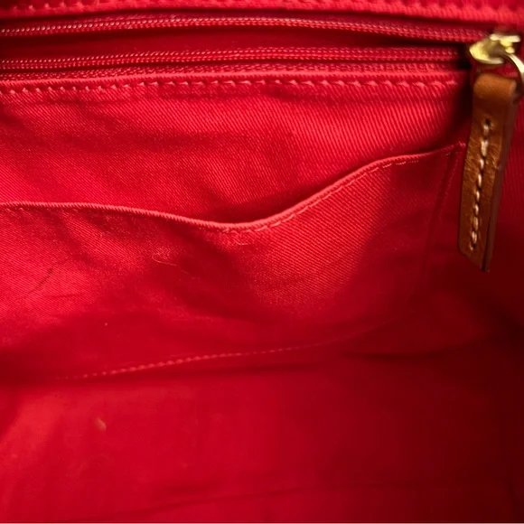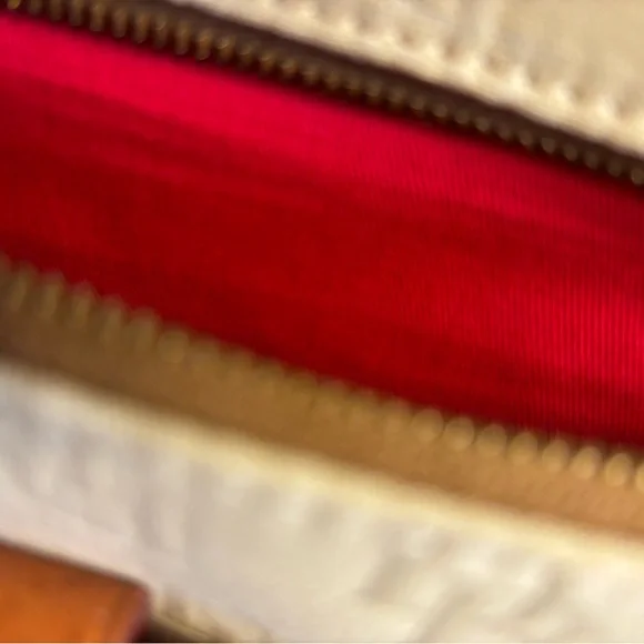 Elevate your style with the Dooney & Bourke tote bag. Featuring a chic cream color with leather accents, this bag is perfect for any occasion. Enjoy the blend of elegance and functionality. Width is 16” height is 10.5” and depth is 6” Zippered pocket and a snap pouch in front. Inside zippered pouch and an open pouch on one side and a snap pouch and an open pouch on the other side. Classic red lining with genuine florentine vacchetta leather. One tiny spot on inside pocket lining. Gorgeous tote nearly new!