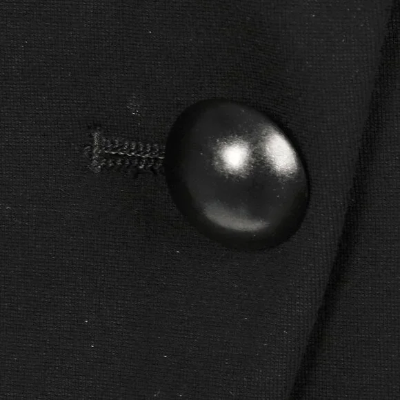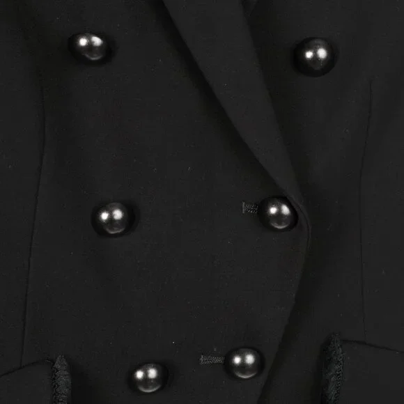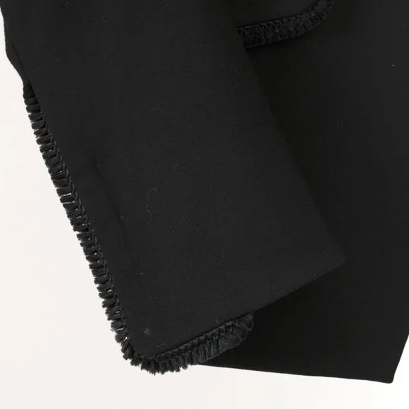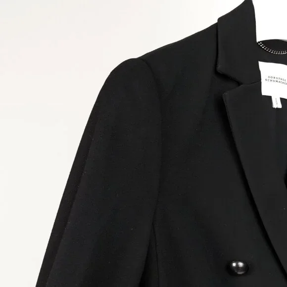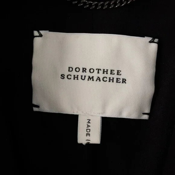 Circa 2017, this tailored blazer from Dorothee Schumacher is crafted in a black ponte, and is adorned with a tonal fringe on the cuffs and pockets. It features long sleeves with vented cuffs, lightly-padded shoulders, a V-neck with a notched lapel collar, a double-breasted button front, front flap pockets, a back vent, and is lined in a tonal satin.Size: 2 (S)Condition: Great; light residual marking on neckline, inner underarms, cuffs; light spotting on front left, and cuffs.Approximate Measurements (laid flat):Shoulder: 15" (38 cm)Chest: 17.25" (44 cm)Waist: 16" (40.5 cm)Length from back: 25" (63.5 cm) Sleeve length: 24.75" (63 cm)Composition: Shell fabric: 67% viscose, 28% polyamide, 5% elastane. Lining: 100% polyester.