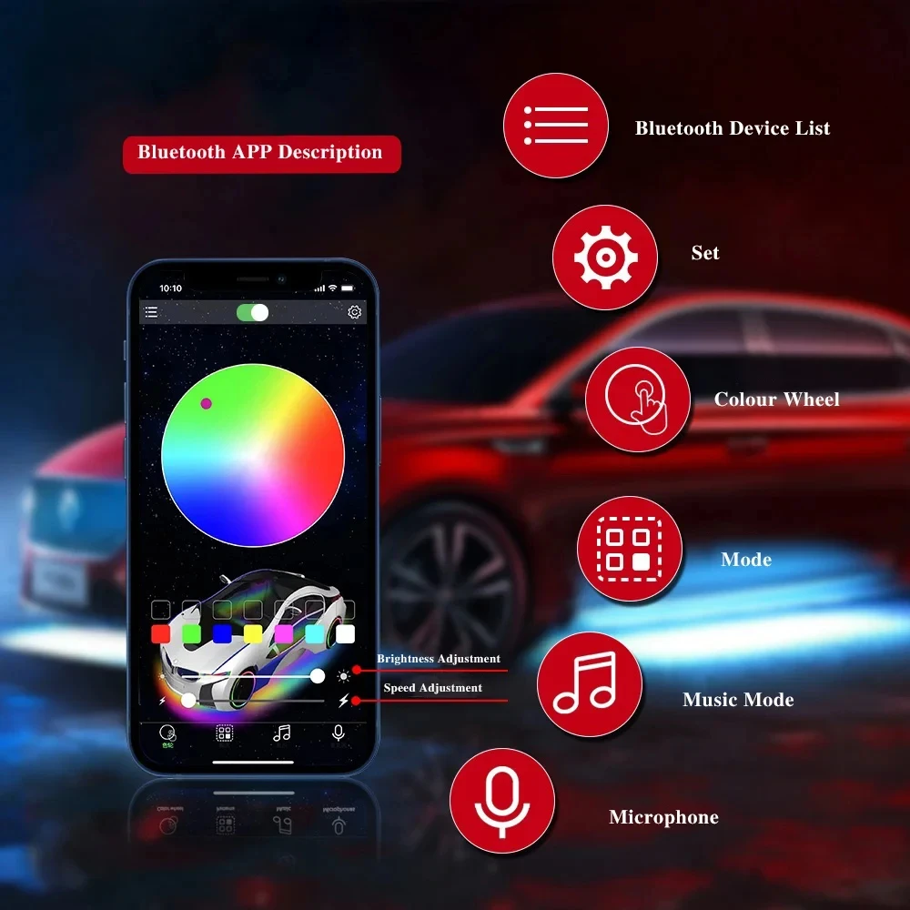 1) Active sound effects: The LED under the car's brightness system is equipped with sound sensors that allow the LED lights synchronized with musical rhythm. The LED light music strip follows the rhythm and adjusts the flicker to adapt to the strength of the sound.