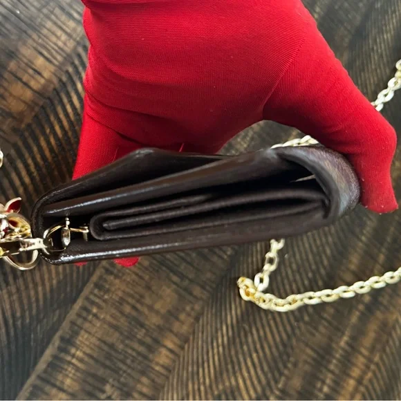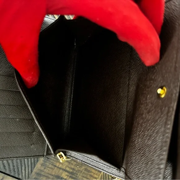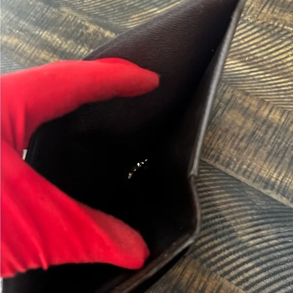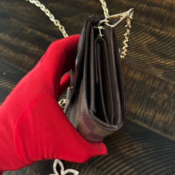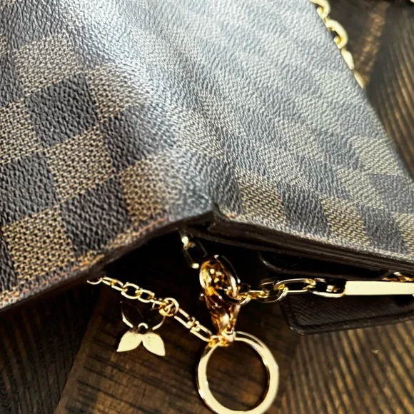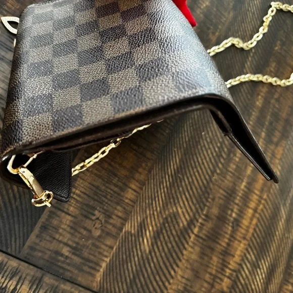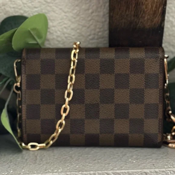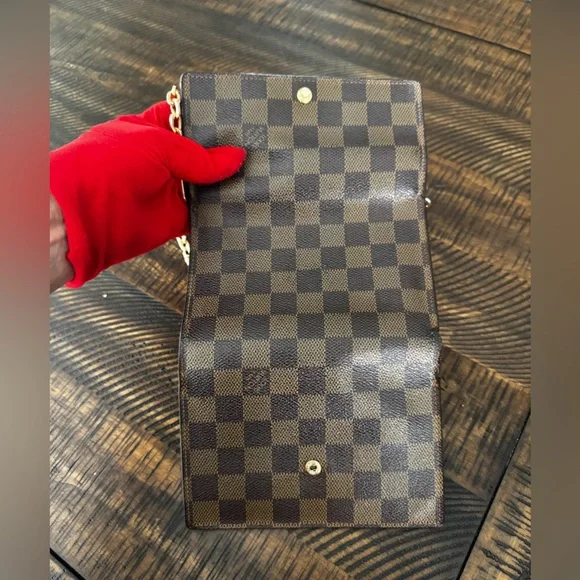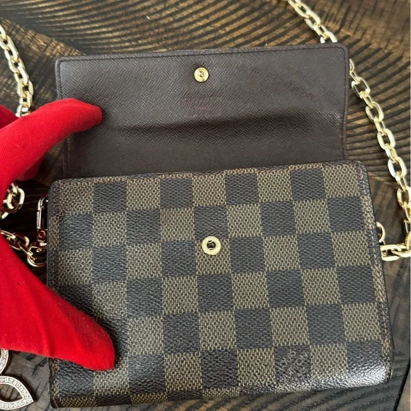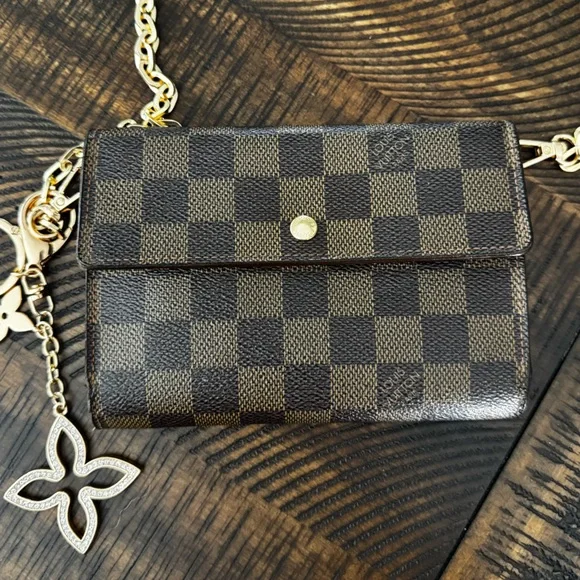 DescriptionLouis Vuitton Porte-Trésor Étui Papier WalletFrom the 2000 CollectionBrown Coated CanvasDamier Ebene PatternBrass HardwareLeather Lining & Four Interior Pockets with Card SlotsSnap ClosureIncludes a gorgeous unbranded 47 inch chain and unbranded charm so you can wear it as a Crossbody or a walletDetailsEstimated item measurementsHeight: 4.75"Width: 6.25"Depth: 1.25"Will fit a passport, perfect for all your ID, etc. cardsGender: Womenthis is a beautiful vintage piece in wonderful working condition. It has been converted so you can wear it as a wallet or a purse/snap works great exterior good condition no damages interior good condition no damages. The edges have been touched up with edge Cote to improve the look does have some light wear on the corner see picture please ask questions . Please keep in mind when purchasing. This is a preowned item. Thank you.guaranteed 100% Authentic Louis Vuitton wallets are made of sturdy leather. Fakes may smell like plastic or chemicals. please please read my reviews/all offers are considered/bundle save as comes from a clean smoke-free home please ask any questions again when purchasing keep in mind this is preowned vintage item thank you for stopping by. Take care of God bless.🙏🇺🇸