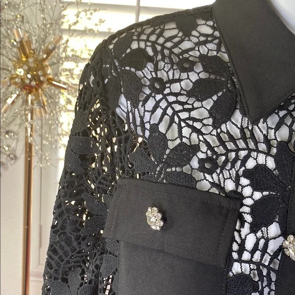 Turn heads in this ultra-luxe black two-piece lace set featuring intricate floral eyelet detailing. The top boasts crystal flower buttons, front pockets, and a polished collar for added elegance. The matching pants are fully sheer with a high-waist cut and built-in shorts lining for comfort and coverage. A dazzling, feminine set perfect for elevated occasions, date nights, or luxury getaways.Top: PTP: 18”Length: 28”Pants: Waist: 15”Length: 46”Rise: 13”