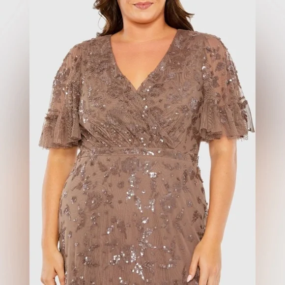 Elevate your style with this gown. Made with embellished fabric, this fully lined dress boasts a V-neckline and short flutter sleeves. The embroidery, accented by all-over sequins, adds a touch of elegance to this faux wrap tiered gown. Enjoy the sheer unlined sleeves for added style.Mac DuggalEmbellished fabric (100% polyester) Fully lined through bodice and skirt; sheer unlined sleevesV-necklineShort flutter sleeves Embroidery accented by all-over sequinsConcealed back zipperApprox. 60" from top of shoulder to bottom hemAvailable in ChocolateStyle #9270Step out in style with this elegant brown evening dress. Perfect for any special occasion, this dress features a flattering silhouette and exquisite detailing. Make a statement with its sophisticated design.