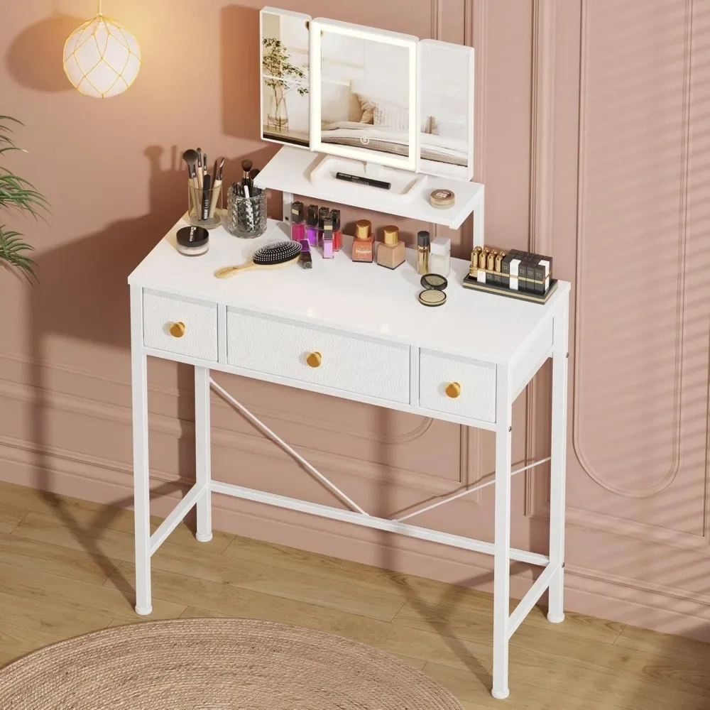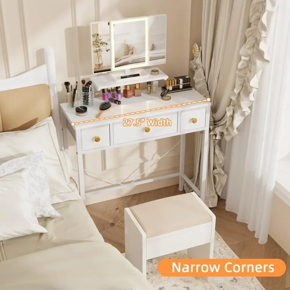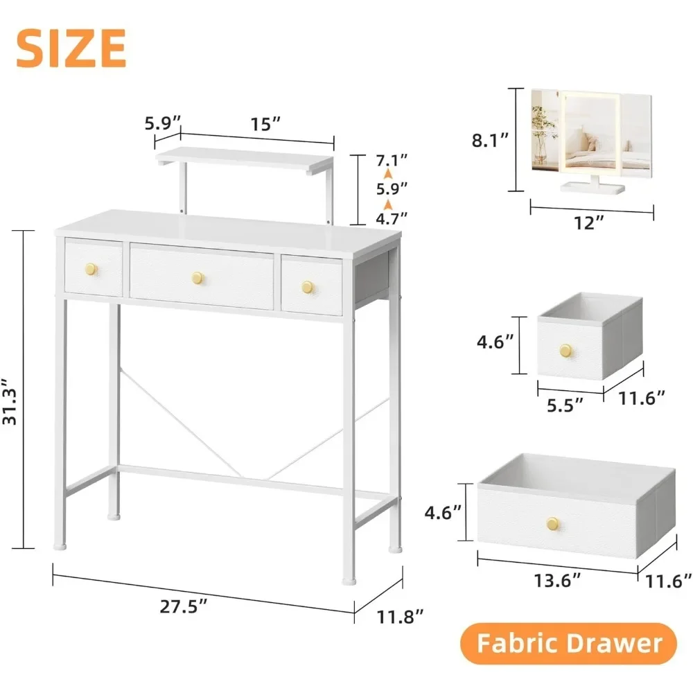 Makeup Vanity Desk 27.5''W with Mirror and Lights, Vanity Desk with 3 Fabric Drawers and Height-Adjustable Stand, dresser