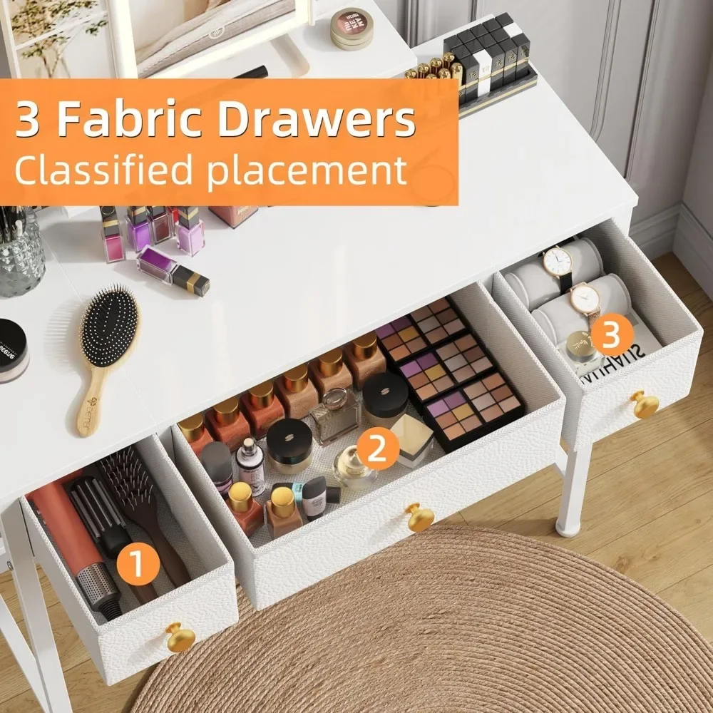 • 【3 Fabric Drawers】Stay organized with 3 spacious drawers that neatly store makeup, skincare, and daily essentials. This smart storage solution keeps your desktop clutter-free, ensuring a clean and efficient makeup space