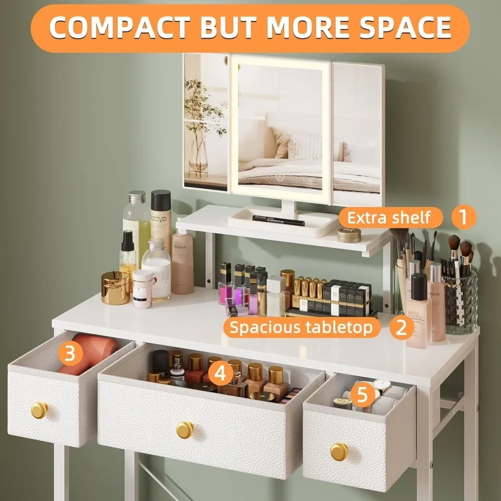 • 【Lighted Mirror】Tri-Fold LED makeup mirror comes with touch controls light and offers 2x and 3x magnification options. 4-In-1 vanity desk with drawers ——providing you with a complete and comprehensive, one-step make-up space; Tips: The mirror needs to be plugged in to light up