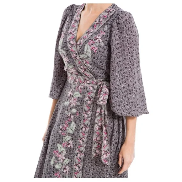 Max Studio Women Dress Max Studio Floral Print Wrap Maxi Size Large $188 RetailA charming print adorns a lightweight maxi dress fashioned with gently puffed balloon sleeves and a wrap-tie closure.• True wrap style with side tie closure elastic waist to back of dress • Surplice V-neck• Long sleeves with elastic cuffs• Partially lined• 100% polyester• Machine wash, line dry• ImportedSee pictures for measurements. Beautiful & pictures don’t do it justice.