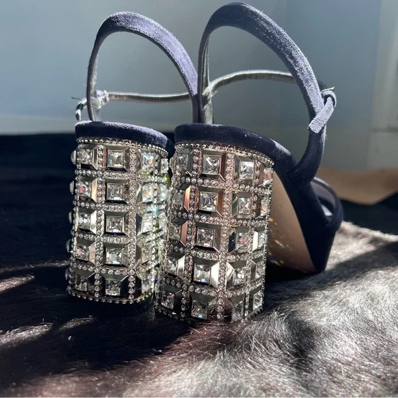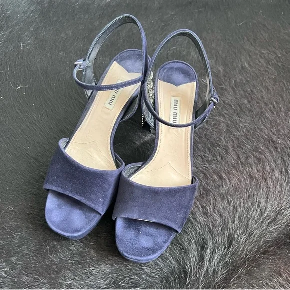 MIU MIU Navy Suede Crystal Block Heel Sandals Platforms Heels $1300 Retail 8.5