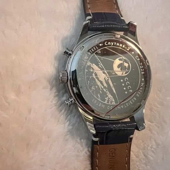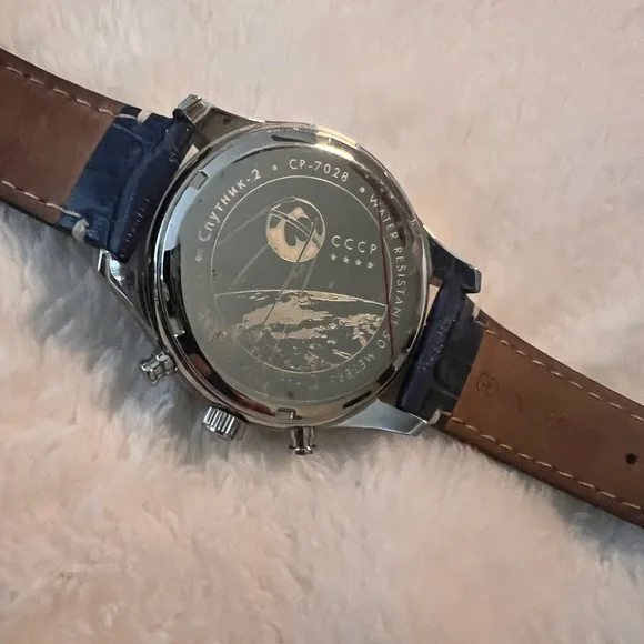 NWOT - CCCP SPUTNIK - TWO QUART // CP-7028 Alexander Shorokhoff Watch.Limited Edition Sold Out WatchWatch has Plastic Seal on back Highly Collectible!Watch is Unworn and in Mint Condition. Box not included Has Plastic covering to protect back n frontDesigned by Alexander Shorokhoff, a name already well-known among watch collectors, CCCP watches draw inspiration from the spirit of the Soviet Union. Each piece features mid-century modern style with precision quartz and automatic movements, combining the best of both worlds.Model - CP- 7028 -03Movement- QuartzCase Diameter - 43mmCase Thickness - 15mmCase Material - Stainless SteelCase Back- SolidDial Color- Silver WhiteWater Resistant- 50mmBracelet Material - LeatherBracelet Color - BlueCondition- New