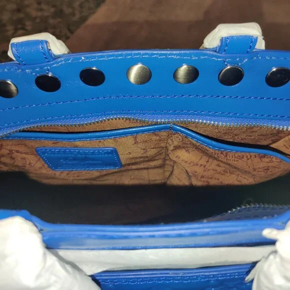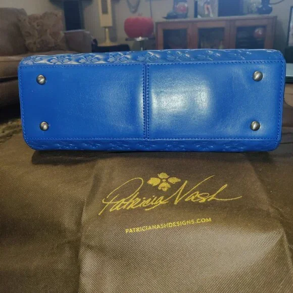 Brand new, unusedPart ofPatricia Nash's limited & numbered Discovery Collection in the style called Minori in a RARE color of sky blue. With a nod to 1950s elegance, this modern Minori satchel offers undeniable sophistication with features like braided leather handles, stud accents, and textural embossing. It's that captivating leather bag that makes you feel like a million bucks. Zip-top closure, braided leather handles, adjustable/detachable strap, grape leaf logo embossing, stud detail, exterior rear slip pocket, metal feetSignature map print interior lining, zip pocket, two slip pocketsMeasures approximately 13-3/8"L x 4-7/8"D x 9-1/2"H with a 5-1/2" handle drop and a 17" to 20" strap drop, weighs 2 lbs, 8 ozBody 100% leather; lining 100% polyester
