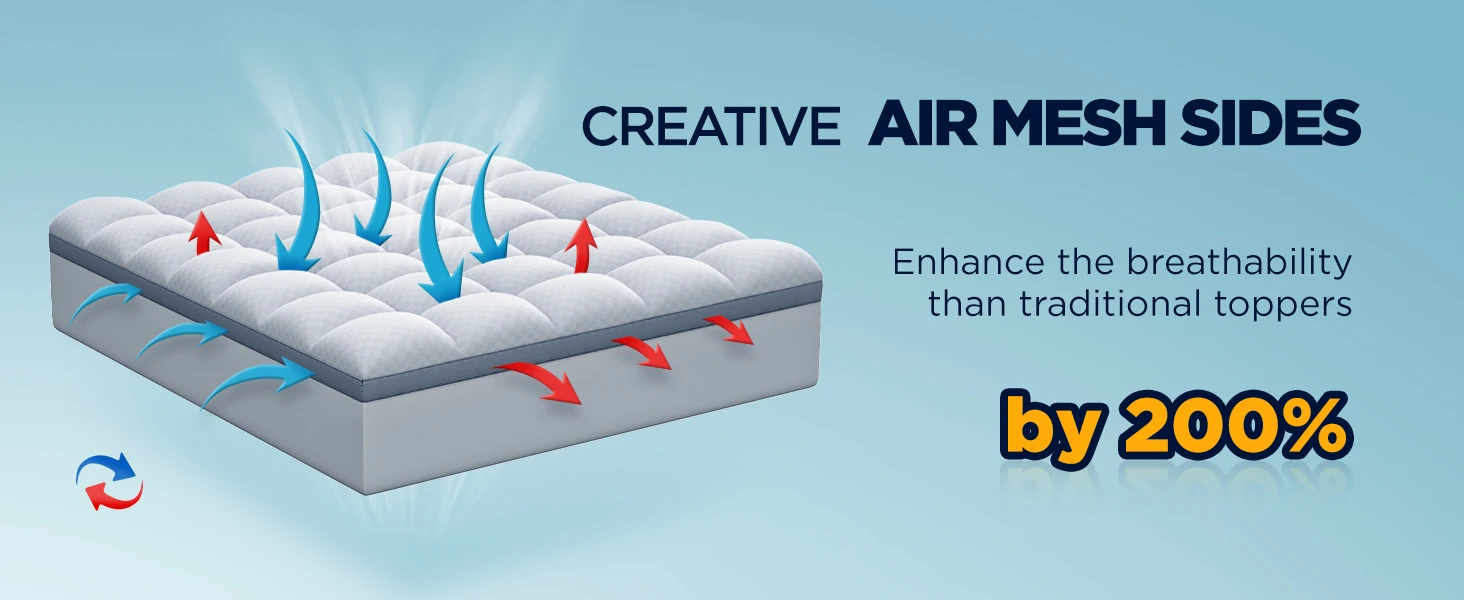 2. 【THE TOPPER THAT CAN "BREATHE"】 Featuring the creative air mesh sides design, Biteany cooling mattress topper enhances breathability by nearly 200% compared to others. This unique design allows the air to flow in & out from all sides, effectively wicking away the moisture and heat to keep you cool and dry throughout the night.