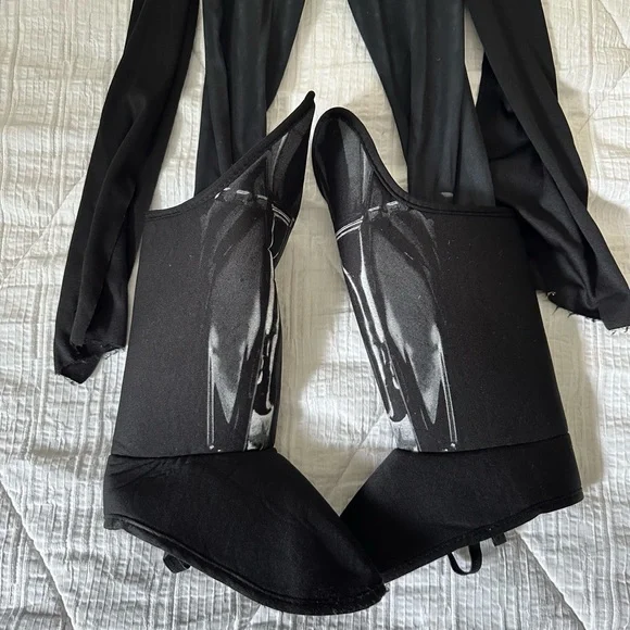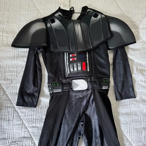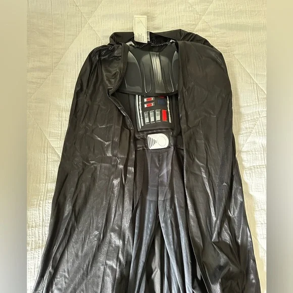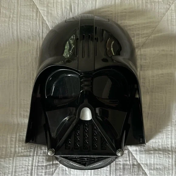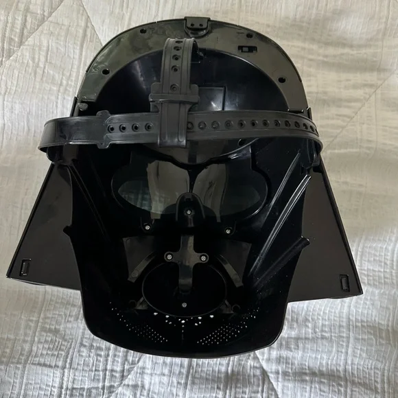 Battery operated (3 AA, just replaced) Talking Darth Vader Helmet Face Mask.One button near each temple. One says several pre-recorded Darth Vader phrases and the other button lets you talk with a voice mutator over your voice.Also comes with a child’s Small Star Wars Darth Vader Halloween costume with Velcro Removable Cape.