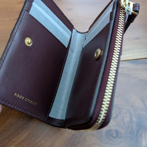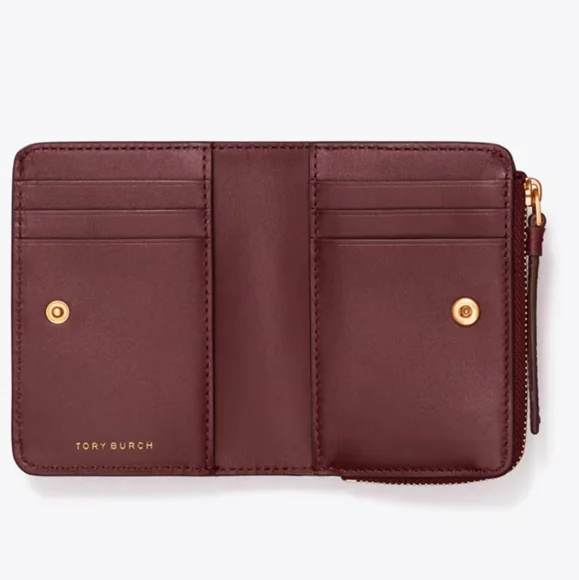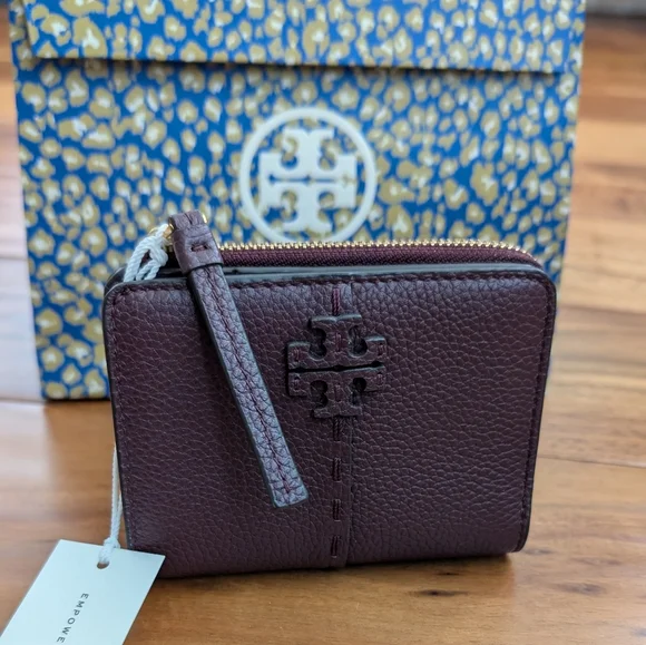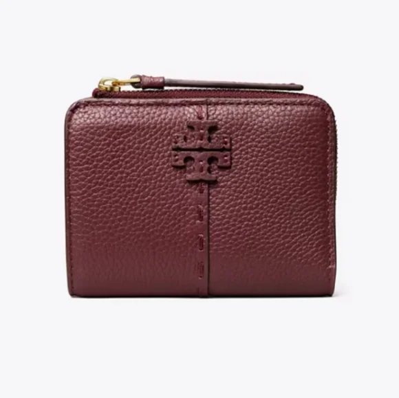 Item: Wallet + Gift Bag Brand: Tory Burch / Mc GrawCondition: New with TagsSize: Height: 3.5" (9cm); length: 4.5" (11.5cm)Color:Material: Pebbled leather; napa leather trimStyle: 148751Product Details:Clean lines underscore exquisite craftsmanship. Pebbled leather is crafted with hand-stitching and a discreet leather logo. With a slim profile, the McGraw Bi-Fold Wallet is perfectly sized for mini bags, with multiple compartments, including a coin pocket. Crafted in partnership with a Leather Working Group-certified tannery, supporting high standards in leather manufacturing and chemical managementHeight: 3.5" (9cm); length: 4.5" (11.5cm)Pebbled leather; napa leather trimPin snap closure1 zipper coin pocket, 1 bill pocket, 2 slit pockets, 6 card pocketsWalletsStyle Number 148751