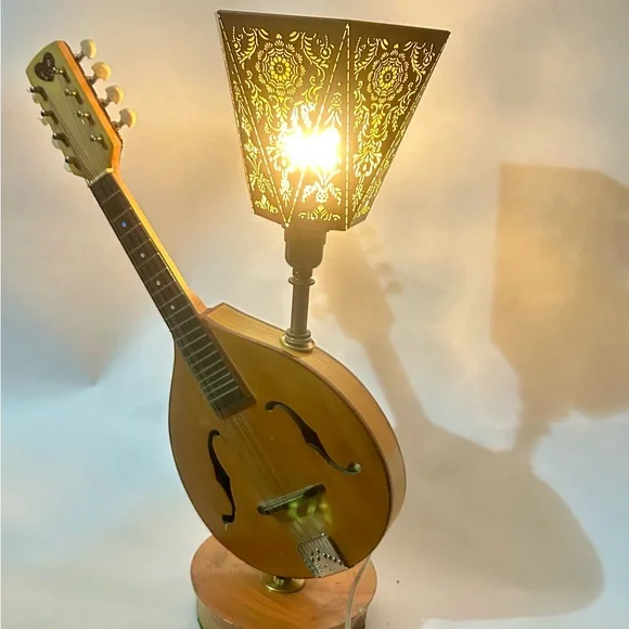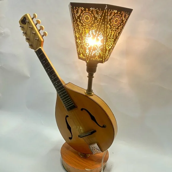 This is a unique table lamp crafted from a unique mandolin and upcycled parts. One of a kind.
