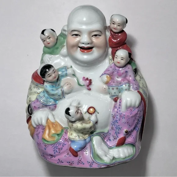 The Laughing Buddha is based on a 10th-century Chinese monk known for his happiness, eccentric behavior, and bag of possessions. He represents happiness, contentment, abundance, and good luck. The children in the statue symbolize fertility, luck, and happiness. According to Feng Shui, placing the Laughing Buddha facing the main door brings good luck and prosperity. The figure measures 6.5 inches tall by 5.5 inches wide and is in excellent condition (see photos). Be sure to make an offer on this or one of my other listings which feature many unique and hard to find items - Crystal and Glassware, Fine Artwork, Rare DVDs, Art Glass, Asian Rarities, Celebrity Autographs, Fine Porcelain, Quality Jewelry, Hollywood Memorabilia and much more.